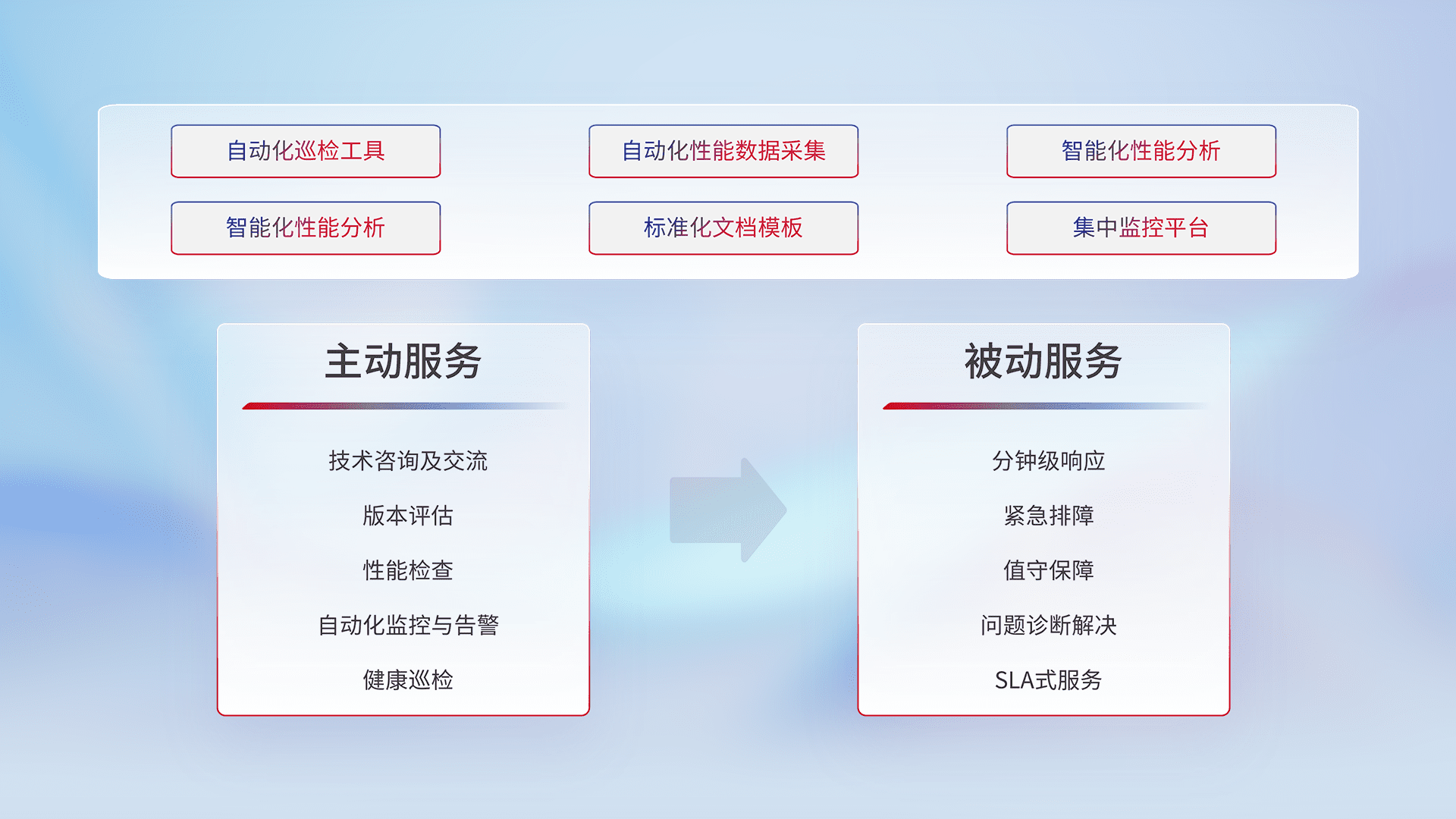 智能化工具和标准化文档,,,,保障服务质量,,,,提供主动服务(包含技术咨询、、版本评估、、、、性能检查、、自动化监控与告警、、、、健康巡检)和被动服务包含(分钟级响应、、、、紧急排障、、值守保障、、、、问题诊断解决、、、SLA服务)。。。